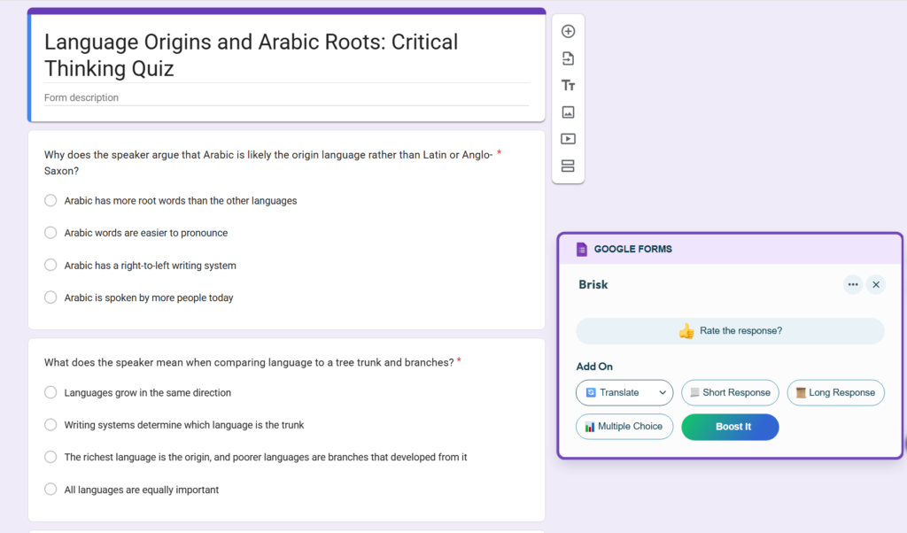 Language teachers can easily and quickly create assignments using YouTube videos in the target language, then generate comprehension questions for students based on the video content using Brisk. Teachers have complete control over the questions and can review each one before sharing it with the students. If they feel the question does not accurately reflect the content, they can edit or remove the question within the same Google Form used to create it, as well as add more questions or change the language of particular questions if desired.