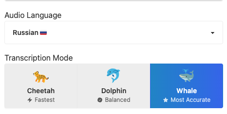 Picture 1 - Transcription settings - Transcribe files - audio/video file, you choose audio language, transcription mode (cheetah - fastest, dolphin - balanced, whale - most accurate), speaker recognition settings, transcribe to english, and restore audio